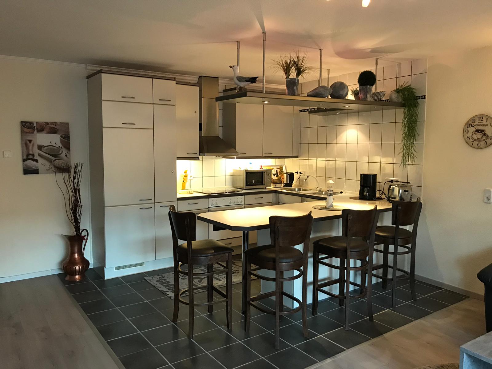Die Küchenzeile ist großzügig ausgestattet und lässt keinerlei Wünsche offen. Sie beinhaltet einen Kühlschrank mit Gefrierfach, Ceranfeld mit Backofen, Geschirrspülmaschine, Wasserkocher,Heißluftfriteuse, Kaffee - und Kaffeepadmaschine, Eierkocher, Mikrowelle und Toaster.